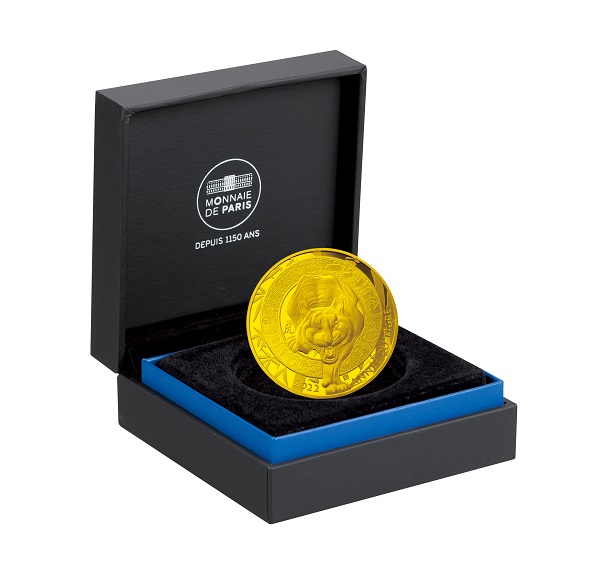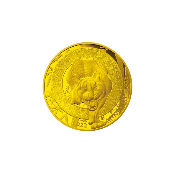 【表面】 正面から見た虎が雄叫びをあげながら輪の中から身を乗り出している、フランス国立造幣局らしい独創的なデザイン。輪の中には十二支の動物や植物のモチーフ、周囲には竹林が微細な彫刻で描かれています。中国の書道家・趙長青氏による「虎」の文字や仏語「ANNÉE DU TIGRE」と刻まれています。 【裏面】 中国の伝統的な寺院の扉が右上に円形で描かれ、それを扇状に取り囲むように十二支の動物たちが精緻な彫刻技術でランダムかつ重層的に描かれています。周りには年号(2018年~2029年)や、フランス語で「CALENDRIER CHINOIS」(中国暦)と刻まれています。 |
