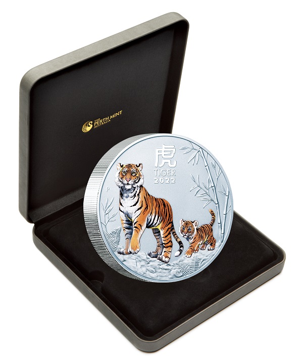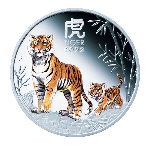 30豪ドルカラー銀貨 【裏面】 岩場を歩く愛らしい親子の虎の姿が鮮やかなカラーで描かれ、周りには竹やシダ植物などがコラージュされています。漢字で大きく「虎」、英語で「TIGER2022」、パース造幣局のシンボル「P」も刻印されています。直径約100㎜(500円玉硬貨の約3.77倍)、重さ約1kg(同約143倍)、厚さ14.5㎜の圧倒的な存在感とともにお楽しみいただけます。 ※表面は100豪ドル金貨と同じデザイン。 |